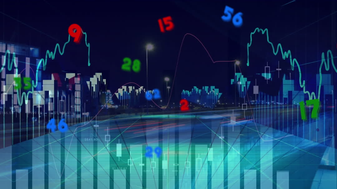 Digital Financial Analytics Visualization with Cityscape Background Video
