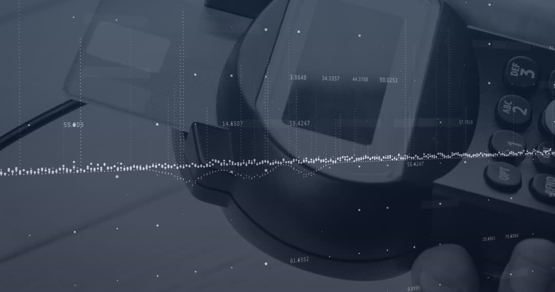 Conceptual illustration featuring payment terminal overlaying digital graphs and financial data, conveying themes of innovation in financial transactions and technology in operations. Useful for presentations related to fintech innovations, digital economy trends, or analytics in commerce.