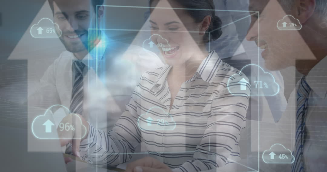 Business professionals collaborating in a modern office environment, surrounded by futuristic digital interfaces representing data processing, financial statistics, and collaborative brainstorming. Videos like this are excellent for illustrating concepts in technology-driven business strategies, digital transformations, finance management, and team innovation dynamics in the corporate tech world.