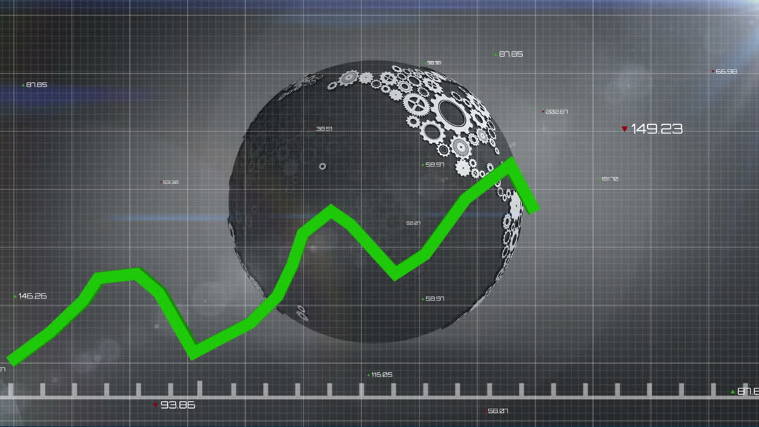 This digital visualization showcases financial data analytics, featuring a green line pattern over a globe filled with gear icons. Ideal for illustrating financial growth, global market trends, or technological integration in reports, presentations, or marketing materials related to business and economic forecasts.
