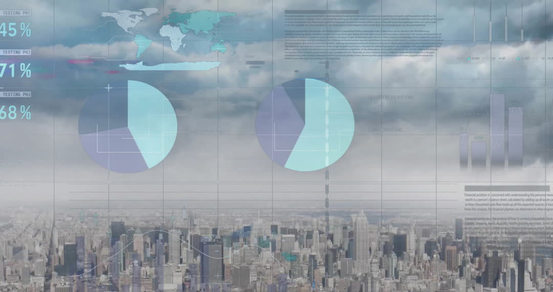Overlay of digital analytics and charts over a bustling city skyline, highlighting global finance. Perfect for illustrating business, technology, and economic growth in presentations, websites, or financial reports.