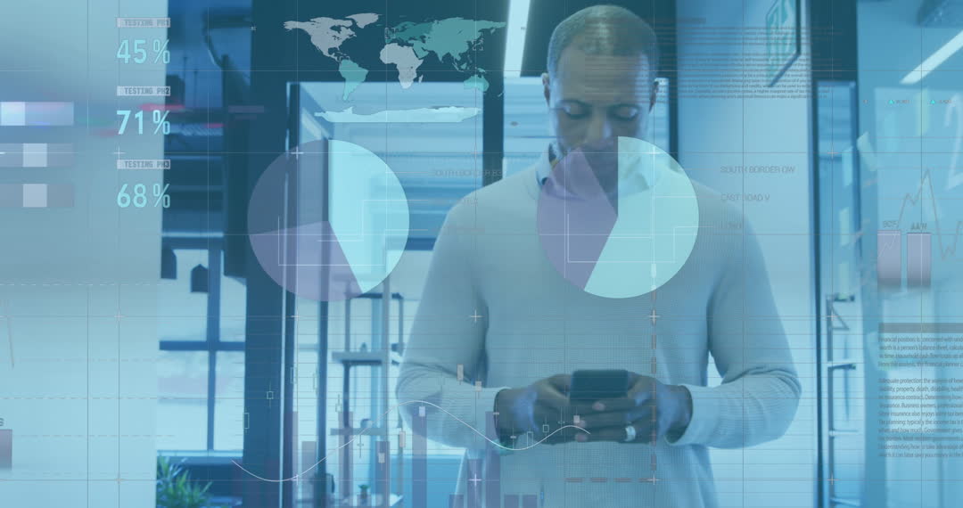 African American businessman interacts with digital financial data displayed by graphs and charts while using smartphone in modern office setting. This video is ideal for business and financial related content, showcasing concepts of technology integration in workplaces, digital economy, data analysis, and global finance strategies for websites, reports or marketing materials focused on digital business growth.