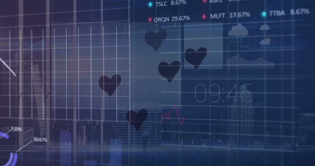 Digital animation of financial data processing overlaid on an empty office backdrop conveys a dynamic business environment. Hearts add a symbolic layer that may highlight globalization, insights or innovation. Suitable for financial presentations, tech innovations, or business advertisements.