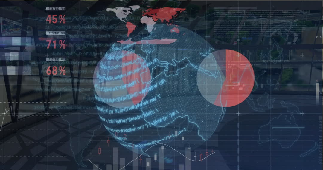 Digital graphic showing an animation of global financial data processing overlaid with a world map, conveying themes of finance, business, and technology. Ideal for use in presentations, reports, or digital marketing content focusing on global finance or tech innovation.