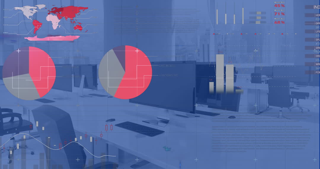 This visualization shows animated financial data, graphs, and statistics overlaying a modern office environment, suggesting themes of business analytics, global financial markets, and technology integration. Suitable for use in business presentations, educational materials, or digital signage highlighting trends in global finance and data analysis in contemporary workspaces.