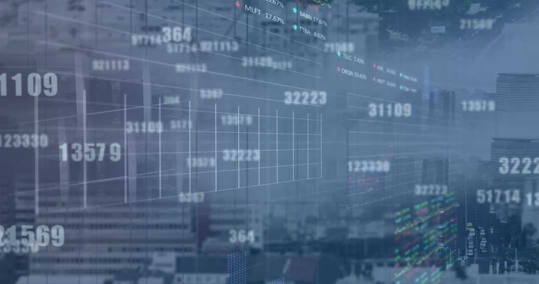 This concept combines digital financial data with a cityscape backdrop, symbolizing the integration of global business and technology. The transparent overlay of graphs and numbers reflects real-time data processing, making it ideal for use in financial reports, business articles, or presentations aimed at illustrating insights on economic growth and market trends.