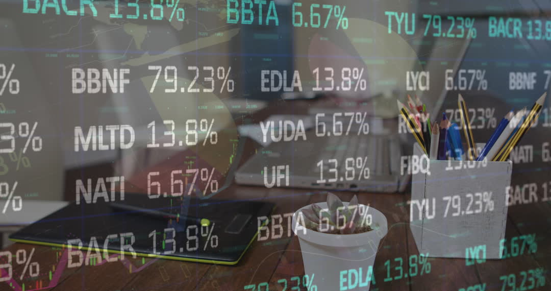 Image features a digital overlay of financial data on an office desk setup with laptops and a tablet. Represents concepts of global business, advanced financial analytics, and digital communication. Ideal for use in business finance or technology articles, presentations, or digital transformation materials.