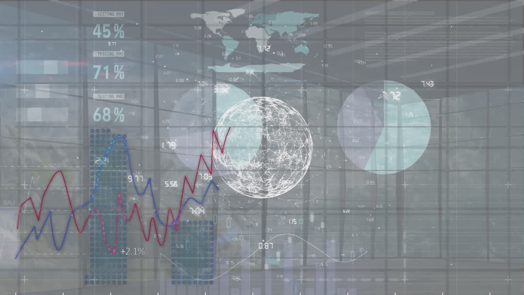 This visualization displays financial data processing with statistical graphs, showcasing global business concepts. Globe and map overlays emphasize international interconnectivity. Useful for fintech presentations, business strategy reports, investment advisories, and corporate dashboard themes.
