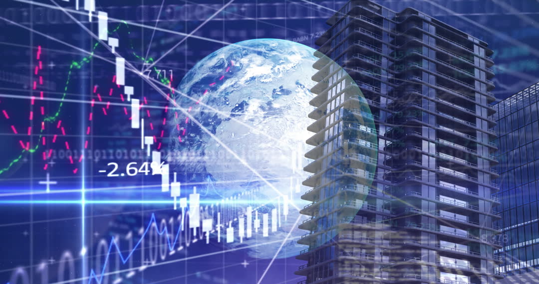 - Digital Financial Data with Globe Overlooking Urban Architecture
