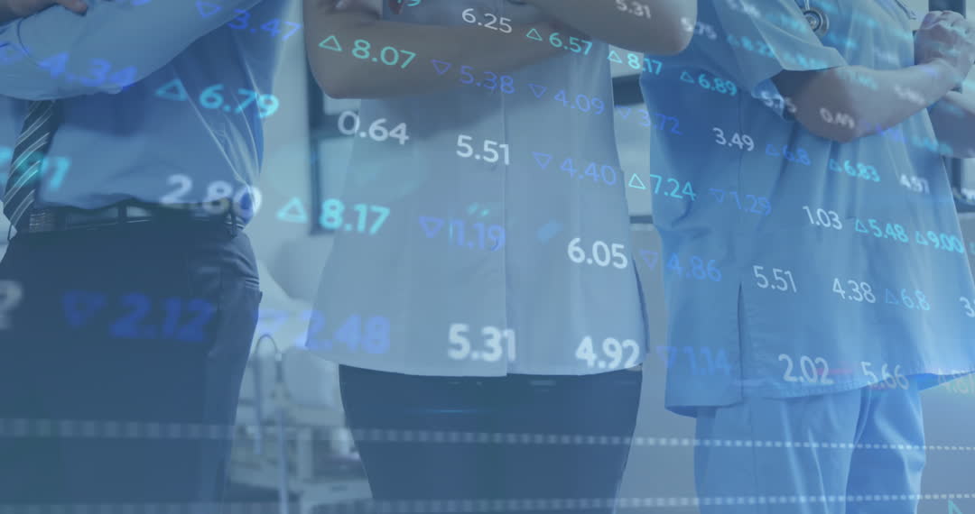 Image depicts financial data overlay on professionals in business and healthcare sectors. Symbols indicate networking and digital communications. Ideal for illustrating concepts of global market analysis, interconnected economies, teamwork in dynamic sectors, innovation, and business strategies.