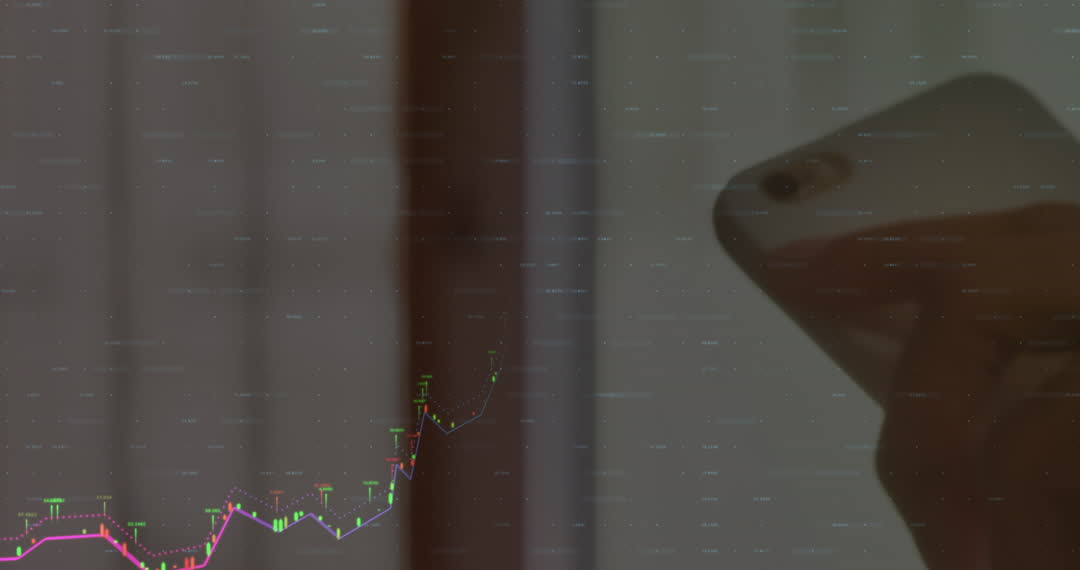Visual representation of a concept integrating digital finance and modern technology interface, featuring smartphone usage and animated market data. Suitable for depicting themes related to global business, economic analysis, or future technology innovations. Ideal for use in sectors like financial services, technology investment, startup presentations, or educational content on economic growth.