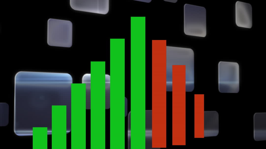 Illustration of a digital bar chart with green and red bars representing financial data, overlayed onto a futuristic backdrop of floating gray tablets. This video is ideal for representing business growth, data analysis, and technology-driven financial solutions in presentations, reports, or marketing materials.