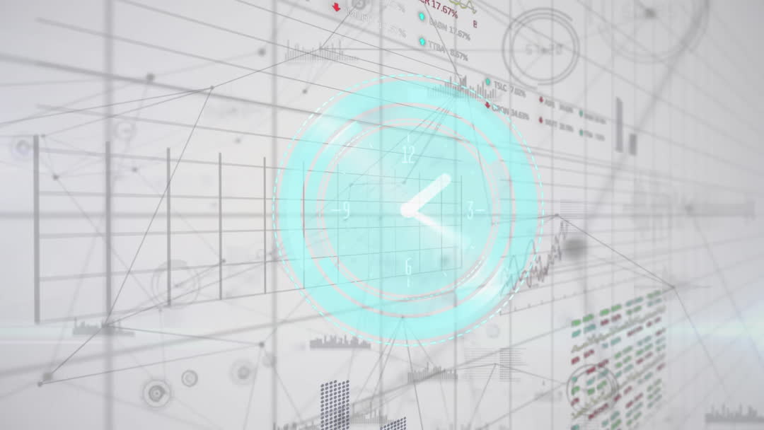 Futuristic video showcasing financial data processing, combined with a clock symbol. Perfect for illustrating concepts of time management in business and evolving digital landscapes in corporate settings. Useful for presentations, tech industry marketing, educational tools, and visual storytelling in the context of business intelligence and data analytics.