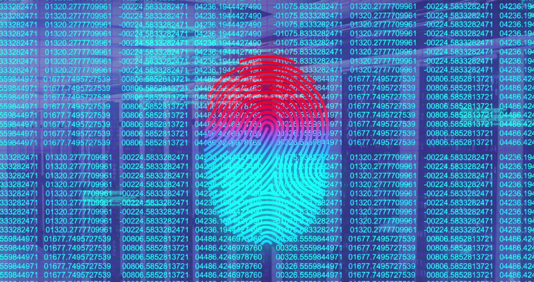 Illustration of a vibrant digital fingerprint emerging from a field of data, symbolizing cybersecurity and biometric authentication. Useful for technology articles, software branding, and data analytics materials reflecting themes of data security, privacy, and advanced technology protection.