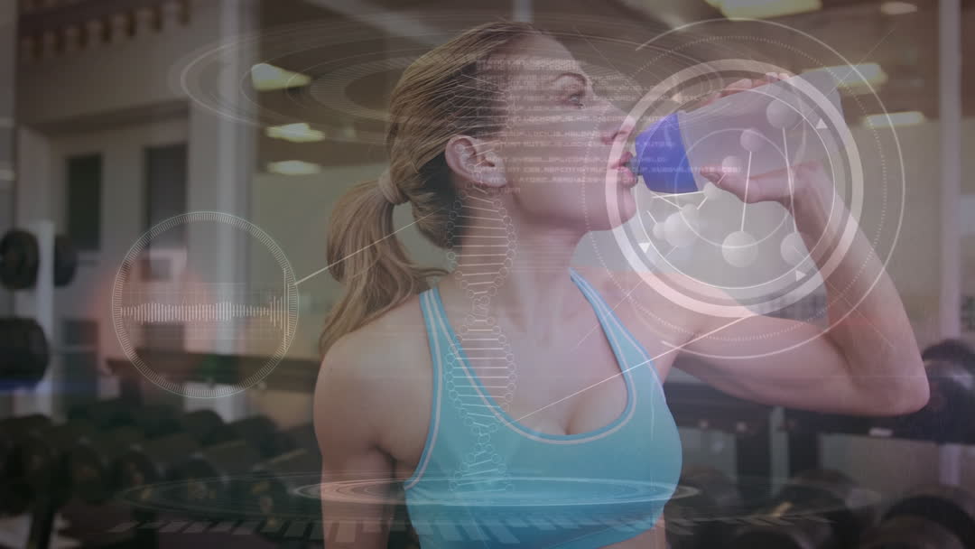 - Digital Fitness Interface Overlaying Woman Drinking at Gym