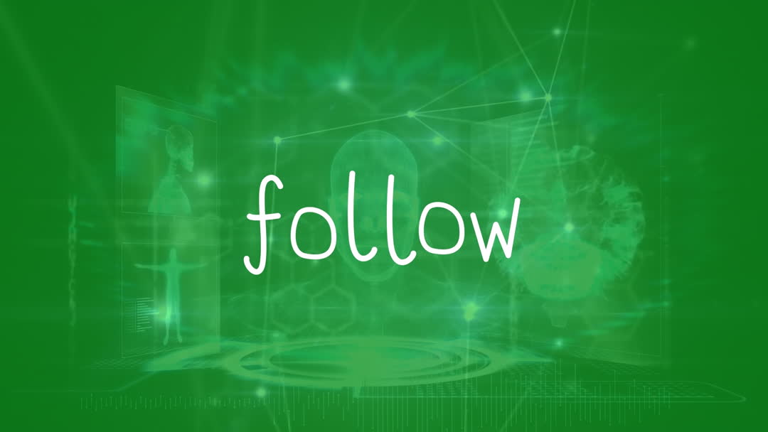 Shows 'follow' text over a background of interconnected digital networks with medical data screens. Illustrates the convergence of social media networking and modern technology, particularly in the healthcare sector. Useful for articles on healthcare innovation, technology integration in medicine, or growth of social media in professional industries.