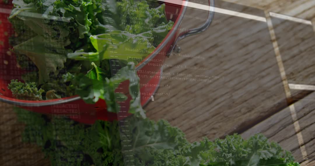Image showcasing combination of culinary kale with digital lines overlaid suggests merging of organic food and modern technology concepts. It may be used to represent the connection between technology and agricultural industries or as part of a design for food tech innovations.