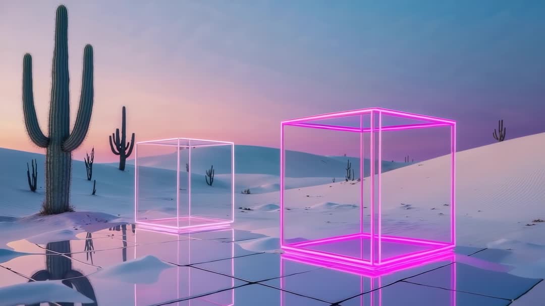 - Digital Futuristic Desert Landscape with Neon Cubes at Dusk
