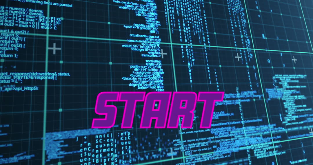 Visual depicting digital game start interface blending with a coding background. This design showcases the interplay of gaming and programming, perfect for use in technology articles, tutorials, or multimedia projects focusing on video game development, software engineering, or technological innovation.