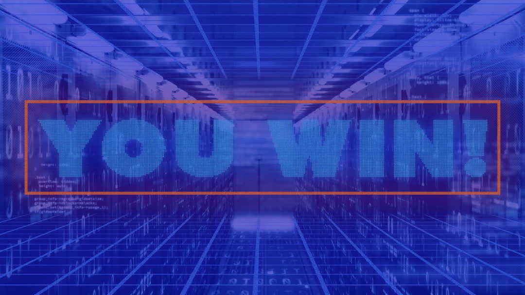 This video features a vibrant 'YOU WIN!' text displayed over a graphical representation of a server room, combining elements of digital gaming with technology. Ideal for technology-related publications, it is useful as a background for cybersecurity workshops, gaming competitions, or video game promotions. The futuristic look also resonates well with cyberpunk themes and can be employed in motivational materials and presentations discussing success in digital interfaces.