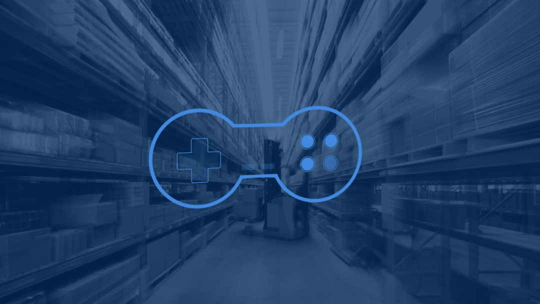 Warehouse with digital gamepad icon overlay, symbolizing the integration of gaming elements and digital interfaces in logistics and storage. Applies the concept of gamification to industrial spaces, enhancing engagement and transparency in operations. Useful for illustrating new technology trends in logistic strategies and digital inventory management.