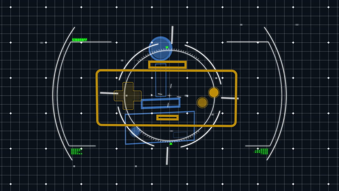 Animation depicts a digital gamepad icon over a scanning scope on a technical grid background, evoking a blend of modern gaming with advanced technological analysis. Suitable for use in presentations or articles related to gaming technology, digital entertainment interfaces, or as a visual component in showcasing virtual reality and linear data infographics.
