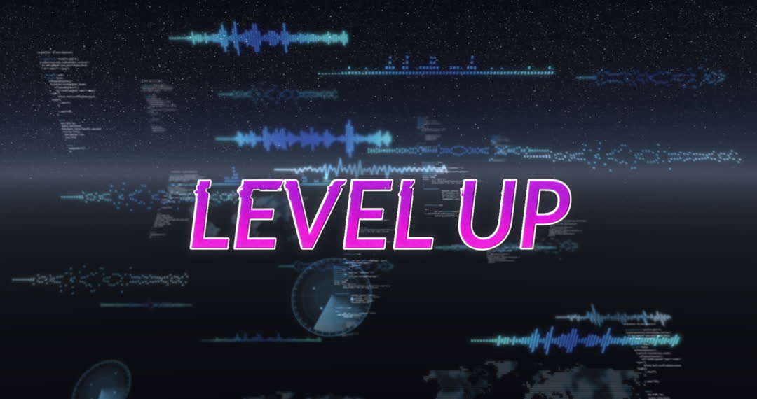 This visual with 'Level Up' text on a digital backdrop symbolizes progress in a digital or gaming context. Ideal for articles or posts about gaming, technology advancements, motivation, or software updates. It captures attention with its vibrant font and data streams, perfect for marketing tech-related products or virtual services highlighting development and innovation.