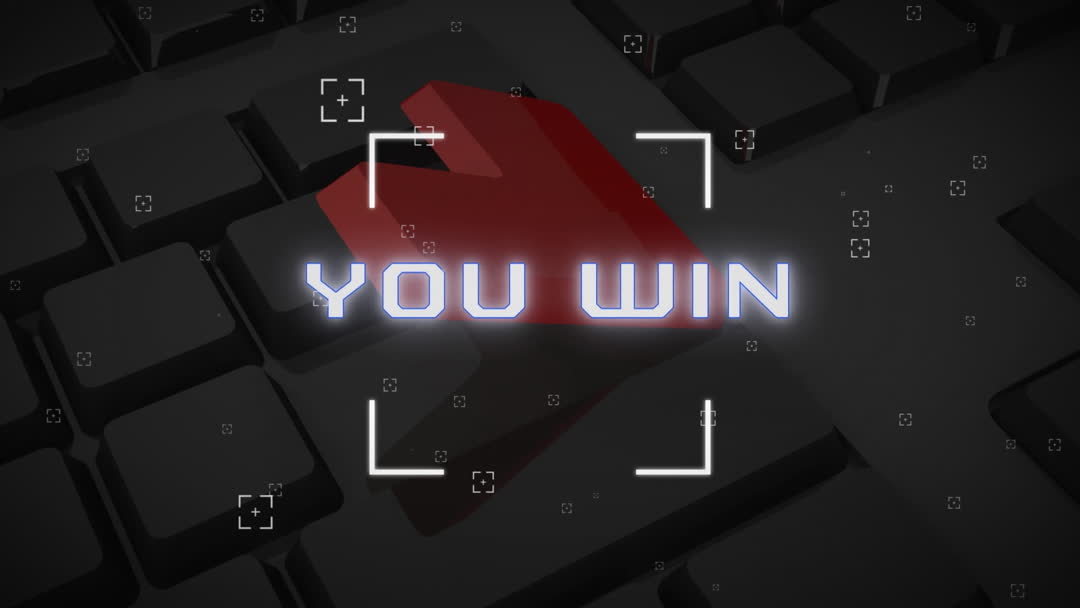 This animated graphic depicting a 'You Win' message superimposed on a keyboard background symbolizes achievement in digital gaming or virtual environments. The visual captures a triumphant moment ideal for use in gaming-related websites, game applications, or promotional content emphasizing digital accomplishments.