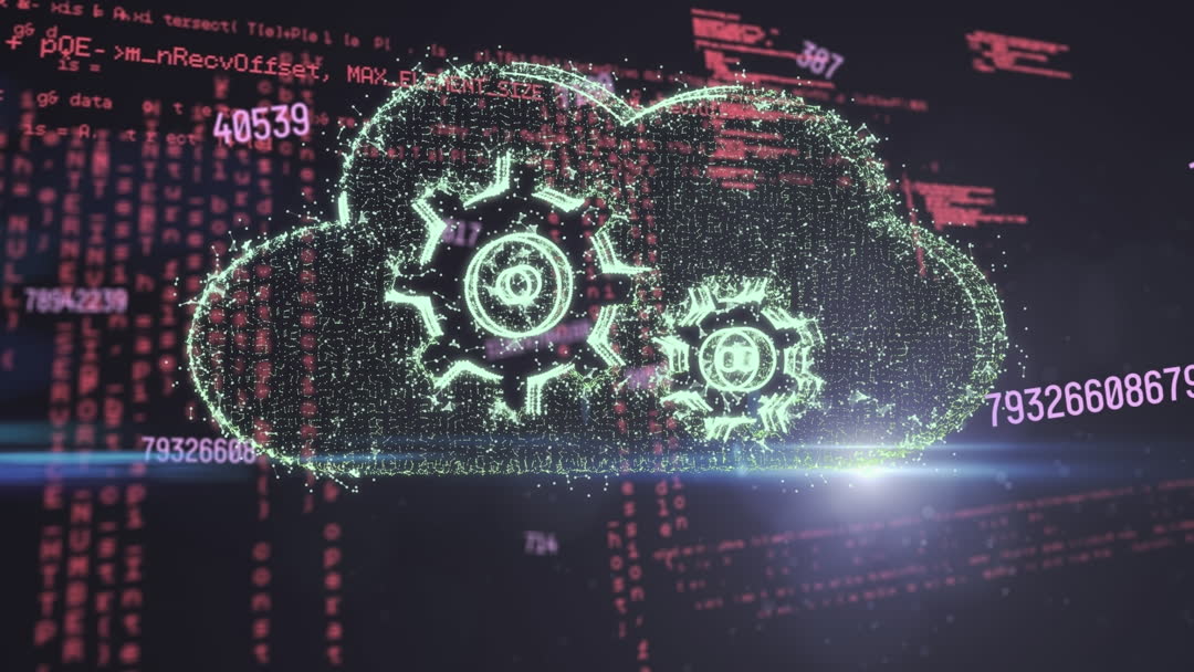 Conceptual video showing digital gears within a cloud shape hovering over streams of data. Holographic effects highlight the intersection of technology and data analytics. Ideal for articles or presentations focused on cloud computing, machine learning advancements, or technological innovations.