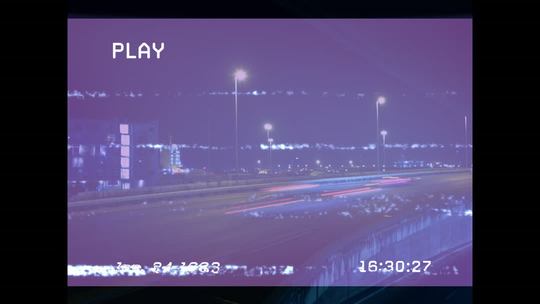 This visual represents an urban highway at night with a digital glitch overlay, giving it a VHS-style aesthetic. The blurred motion of the city traffic adds a sense of speed and modernity. Perfect for use in projects related to technology, city life, or digital effects showcasing futuristic or retro themes.