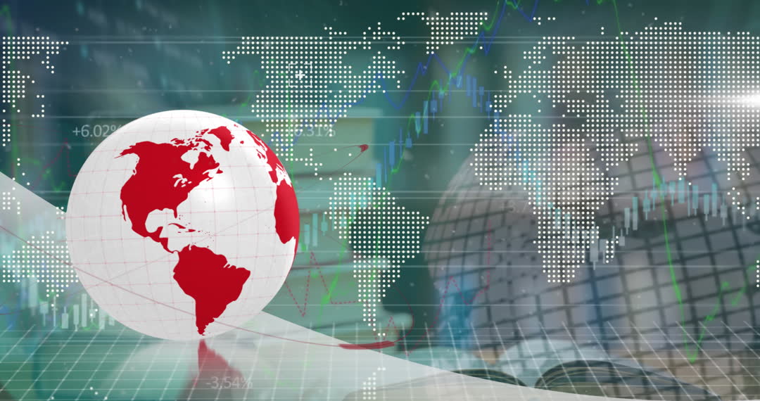 Innovative digital visualization combines globe, world map, and financial data elements. Perfect for presentations on global business analysis, economic trends, or international finance. Suitable for illustrating complex data concepts for business reports or educational content.