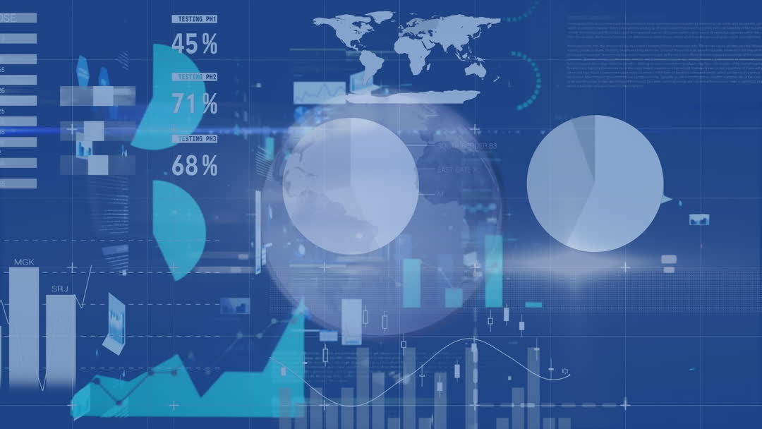 This animation portrays a world map combined with financial data and statistical graphics, symbolizing global business connections and technological integration. Useful for presentations on international trade, finance seminars, and digital economy conferences. The visuals promote an understanding of complex data systems and global market analyses.