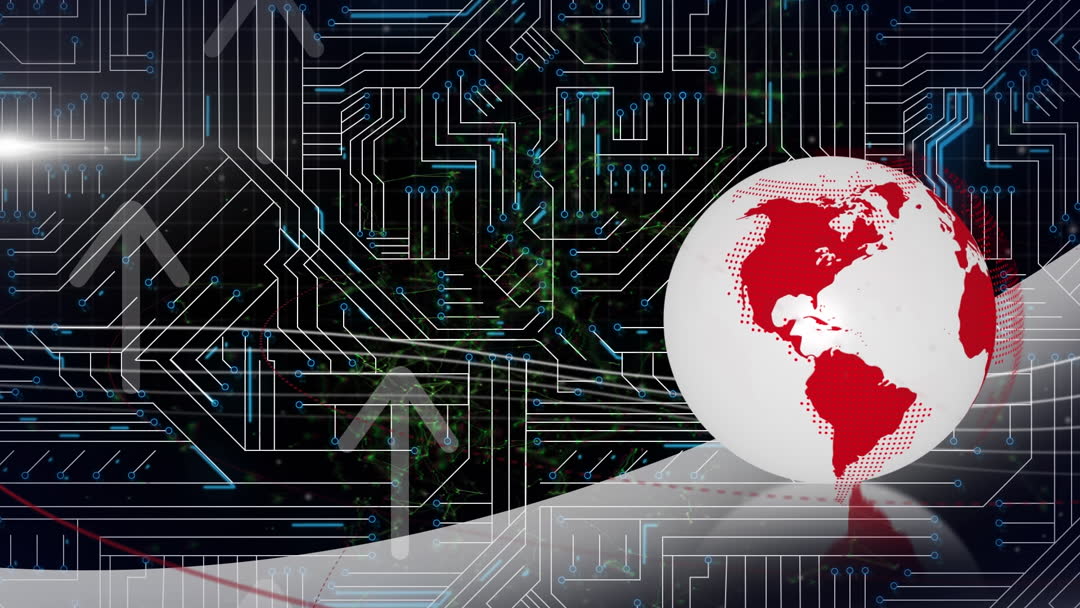 Scene depicts digital representation of global communication with globe against a backdrop of circuit patterns and arrows. Highlights interconnected technology and data exchange in modern world. Suitable for use in technology-related articles, global communication presentations, and digital transformation themes.