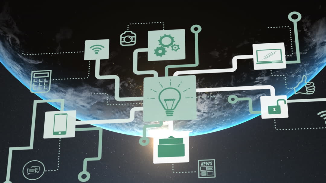 Animated digital layout shows various technology icons connected across the globe, illustrating global connectivity and modern communication methods. Useful for topics on digital transformation, international business, or network connectivity demonstrations.