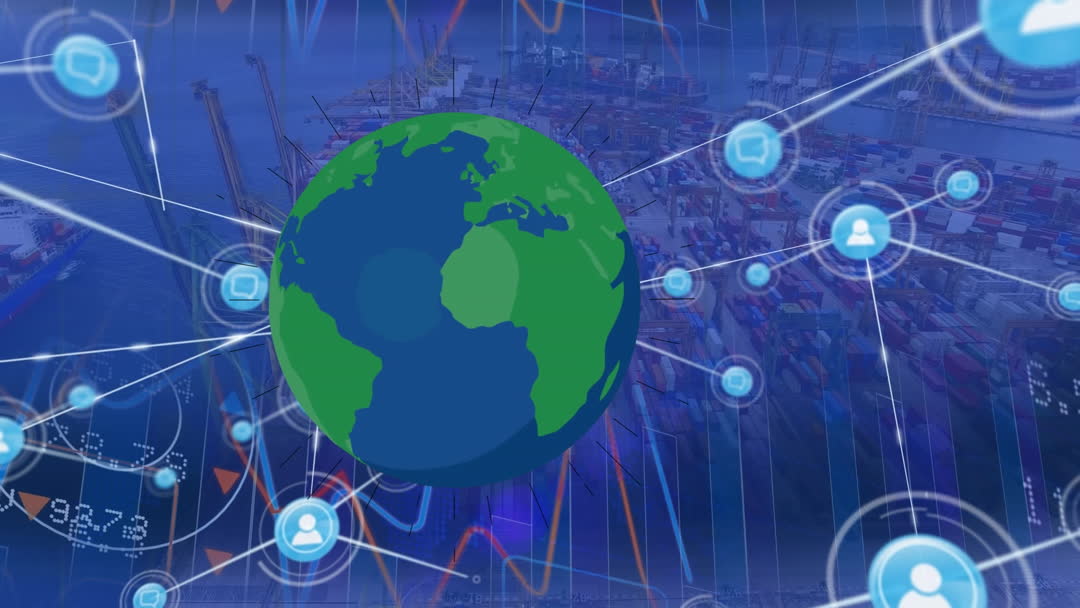 Visual depicting interconnected digital networks with a globe and a cityscape, ideal for representing themes such as global communication, modern technology, and data processing. Useful for presentations, educational materials, or articles focused on innovations in global connectivity and digital networking.