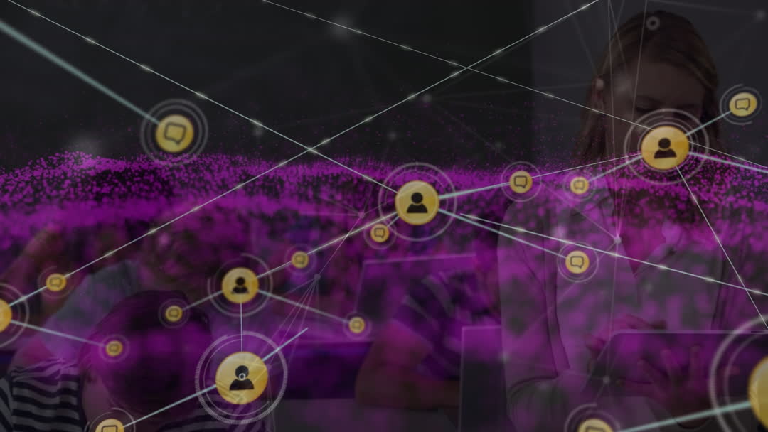 This video illustrates a digital network with interconnected icons superimposed over a cityscape. Purple light patterns accentuate the technology theme, suggesting data exchange and communication flow. This visual can be used in technology-related projects, presentations about global connectivity, internet commerce, modern communication, and smart city initiatives. It effectively conveys a sense of complex, interconnected systems typical in a technologically advanced environment.