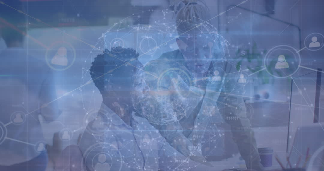 Business professionals collaborating with digital overlay of network connections. Perfect for illustrating concepts of global communications, teamwork, and the impact of tech in modern business settings. Useful in advertisements for digital business solutions, presentations, and tech-focused websites and blogs.