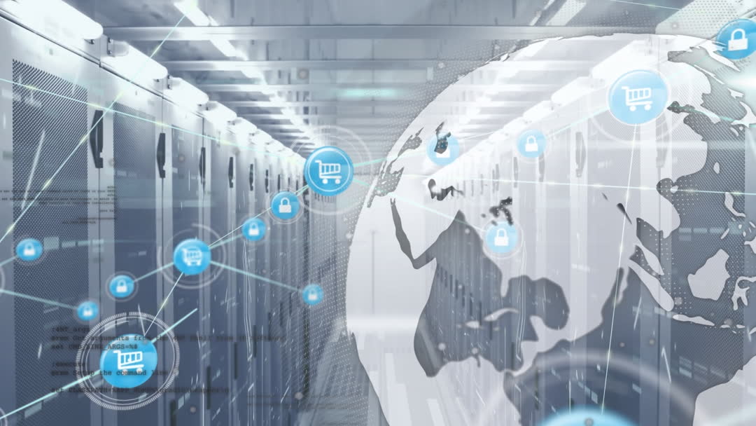 This visualization combines digital icons such as shopping carts with a globe overlaid on a sleek server room interior, symbolizing global business connections and internet commerce. Suitable for illustrating concepts related to digital technology, ecommerce, and data infrastructure. Ideal for tech industry presentations, online courses, or articles emphasizing global connectivity and digital business advancements.