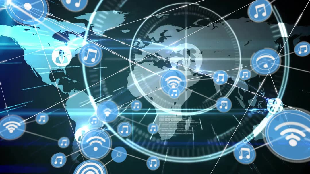 Visualizing global digital connectivity with a central focus on a stylized world map, this videory represents technological communication systems through pulsing nodes and network icons. Useful for illustrating concepts such as the global impact of digital technologies, internet connection, cross-continental communication, and future-ready tech interface. Great for presentations, articles, and educational content about global digital transformation.