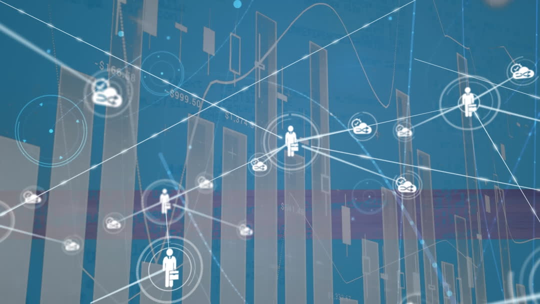 Visual displays interconnected human icons over financial graphs, conveying a sense of global communication and data networking. Ideal for illustrating business innovation, digital technology advancements, and the interconnectedness of global markets. Use in corporate presentations, business strategy visuals, or articles focused on digital transformation in finance.