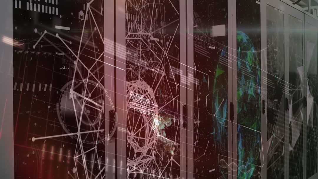 An evocative representation of data and technology merging with the digital world, displayed through a complex network of lines, nodes, and a digital globe overlayed on a high-tech server room background. This video is perfect for illustrating themes related to global connectivity, advanced technological systems, and data networks. Ideal for use in presentations, advertisements, or publications focusing on themes of business technology, IT infrastructure, or data management.