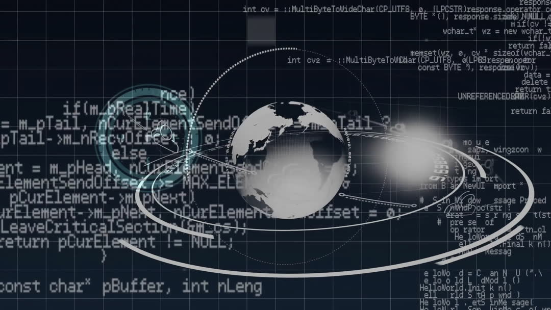 Abstract graphic showcasing digital globe surrounded by layers of interconnected codes, animations, and graphical elements symbolizing data processing and technological integration. Ideal for tech-themed projects, presentations, and backgrounds conveying innovation, connectivity, and global communication dynamics.
