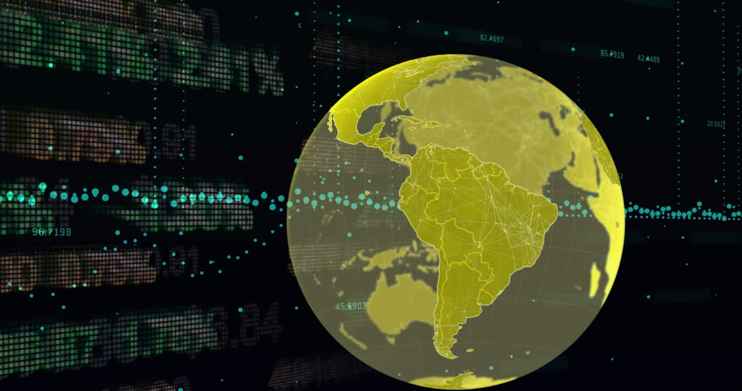 Vibrant animation showing a digital globe superimposed on flowing financial data represents global trade and technology. Ideal for illustrating concepts related to financial markets, data analytics, or international business presentations.