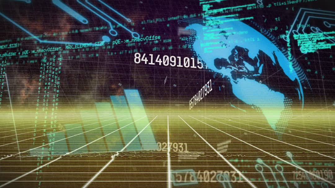 Concept illustration showcasing digital data processing with futurism. Videos of a rotating globe, numbers, graphs intersect over a digital grid, representing interconnectedness. Useful for themes focused on fintech, global data synchronization, technology presentations, and international business solutions.