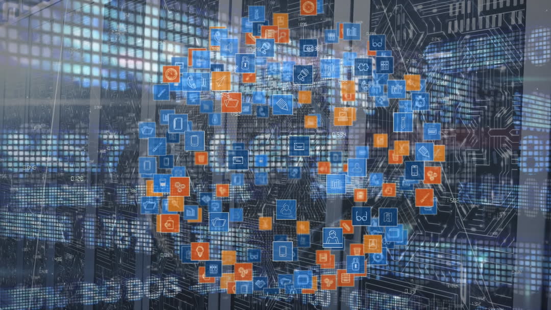 Digital presentation depicting a globe composed of various icons seamlessly integrated with a background illustrating futuristic servers and circuits. Provides a visual metaphor for global digital network, connectivity, and data exchange. Useful for technology presentations, data analysis platforms, or marketing materials for networking and cybersecurity solutions.