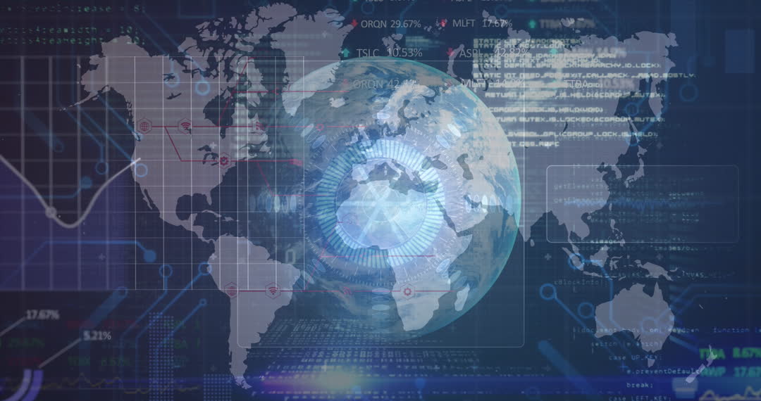 Visual shows a digital globe with layers of data and statistical information overlaying a world map. Highlights the electronic connections between different areas of the globe, symbolizing international networking and communication in a technologically advanced business environment. Useful for representing topics such as global finance, connectivity, data analytics, and innovation.