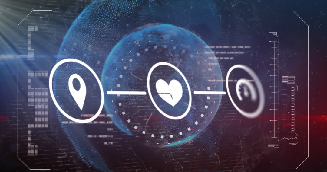 A visually captivating representation of a digital interface over a globe, featuring interconnected icons suggestive of locations, heart monitor, and speedometer. Ideal for illustrating global business concepts, digital innovations, or technology-driven discussions. Useful for websites, banners, or presentations focusing on connectivity, advanced data processing systems, and global communications networks.
