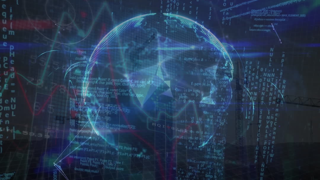 This video depicts a digital globe surrounded by overlays of financial data and code, reflecting the intersection of global business and technology. Useful in illustrating themes of digital finance, global connectivity, tech innovation, and digital interfaces for business or technology presentations and content.