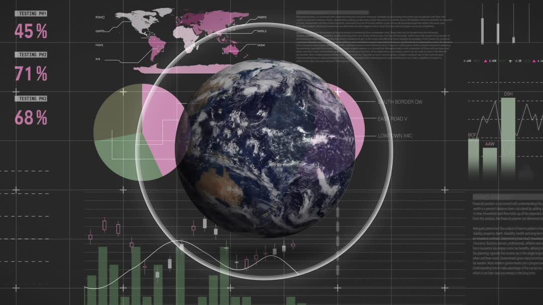 Conceptual digital animation featuring a globe surrounded by various financial data elements such as charts and graphs. Suitable for presenting global finance concepts, data analysis, or branding in the technology and business sectors. Useful for backgrounds in presentations, explainer videos, and educational material related to international markets and digital innovation.