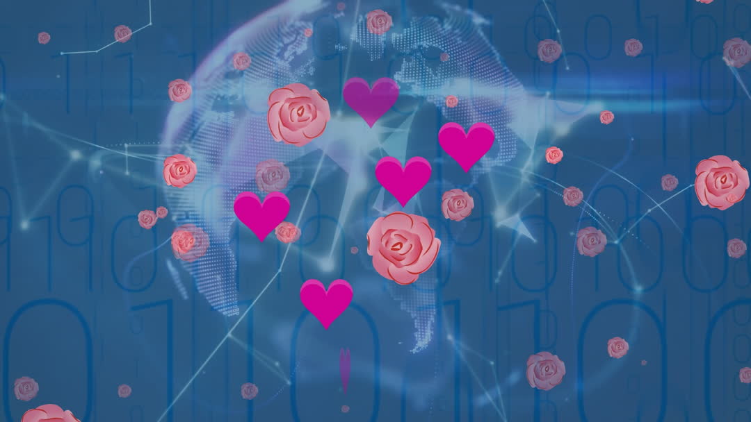 Image shows a digitally rendered globe connected by neon lines with overlay of pink hearts and roses against a blue code background, symbolizing global connectivity and emotions. This can be used for projects involving digital technology, online global relationships, or international communication themes.